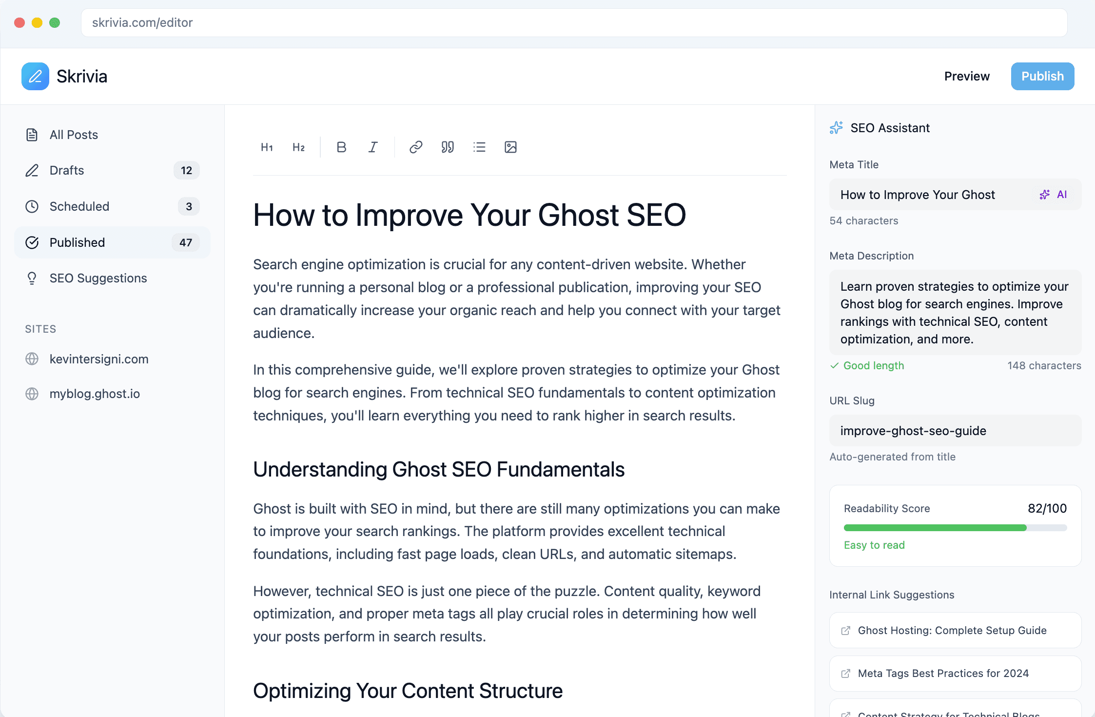 Ghost creators already rely on tools like Ghostboard for analytics and performance insights. Skrivia brings the same level of focus and quality to writing, SEO, and content creation.